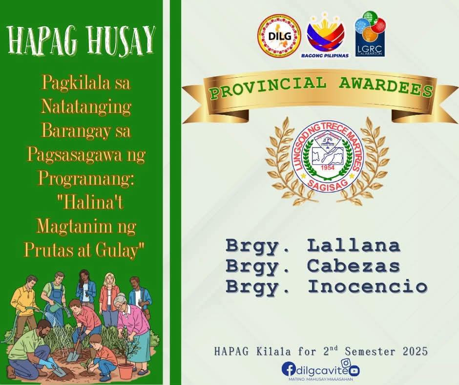 𝑪𝒐𝒏𝒈𝒓𝒂𝒕𝒖𝒍𝒂𝒕𝒊𝒐𝒏𝒔 𝑩𝒂𝒓𝒂𝒏𝒈𝒂𝒚 𝑪𝒂𝒃𝒆𝒛𝒂𝒔 for being one of the 𝙏𝙊𝙋 𝘽𝙖𝙧𝙖𝙣𝙜𝙖𝙮𝙨 in the implementation of “Halina’t Magtanim ng Prutas at Gulay” (HAPAG) Program for the Second Semester of 2025 in the Province of Cavite.